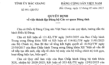 Ngày 12/2/2025, Ban Chấp hành Đảng bộ tỉnh Bắc Giang ban hành Quyết định số...